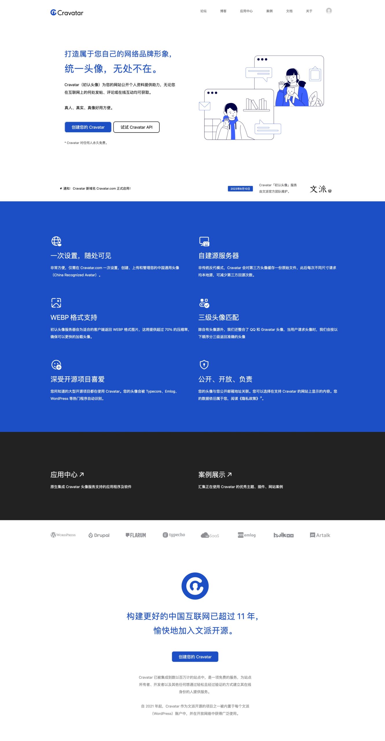 昨天我们启用了新的初认头像域名——Cravatar.com,官网由于是域名备案阶段一直没替换上去,现在已经上传了新的界面样式。