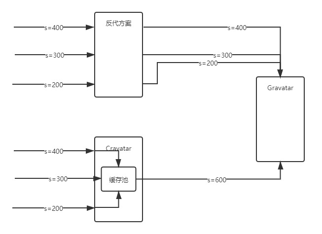 但是 Cravatar 维护了自己的本地缓存池,这使得我们仅需要在第一次时从 Gravatar 取数据,以后的请求则直接从缓存池中取之前缓存的原图并在本地对图像处理,这省略了再次回源的请求流程。以下图片说明了这一过程(其中 s=xxx 代表的是 URL 查询参数):