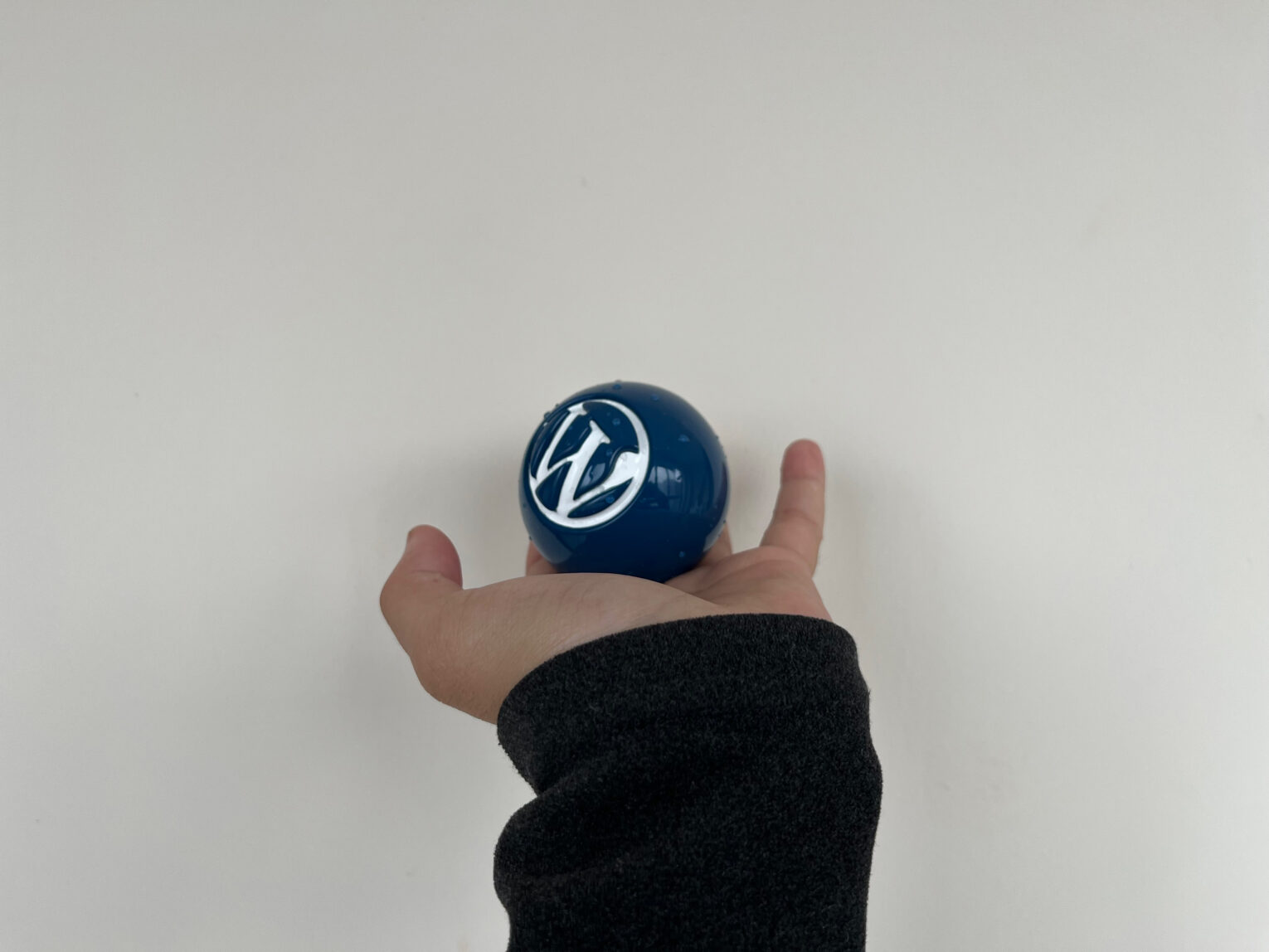 我手上这个球是生产的第3批样品,也就是截止目前换了第3家工厂然后才弄出来了一个相对来说满意的样品。但这一版的最大问题就在于球塞进去之后就拿不出来,而且它的橡胶球也就是你看到的很光泽的球面也是完全实心的。