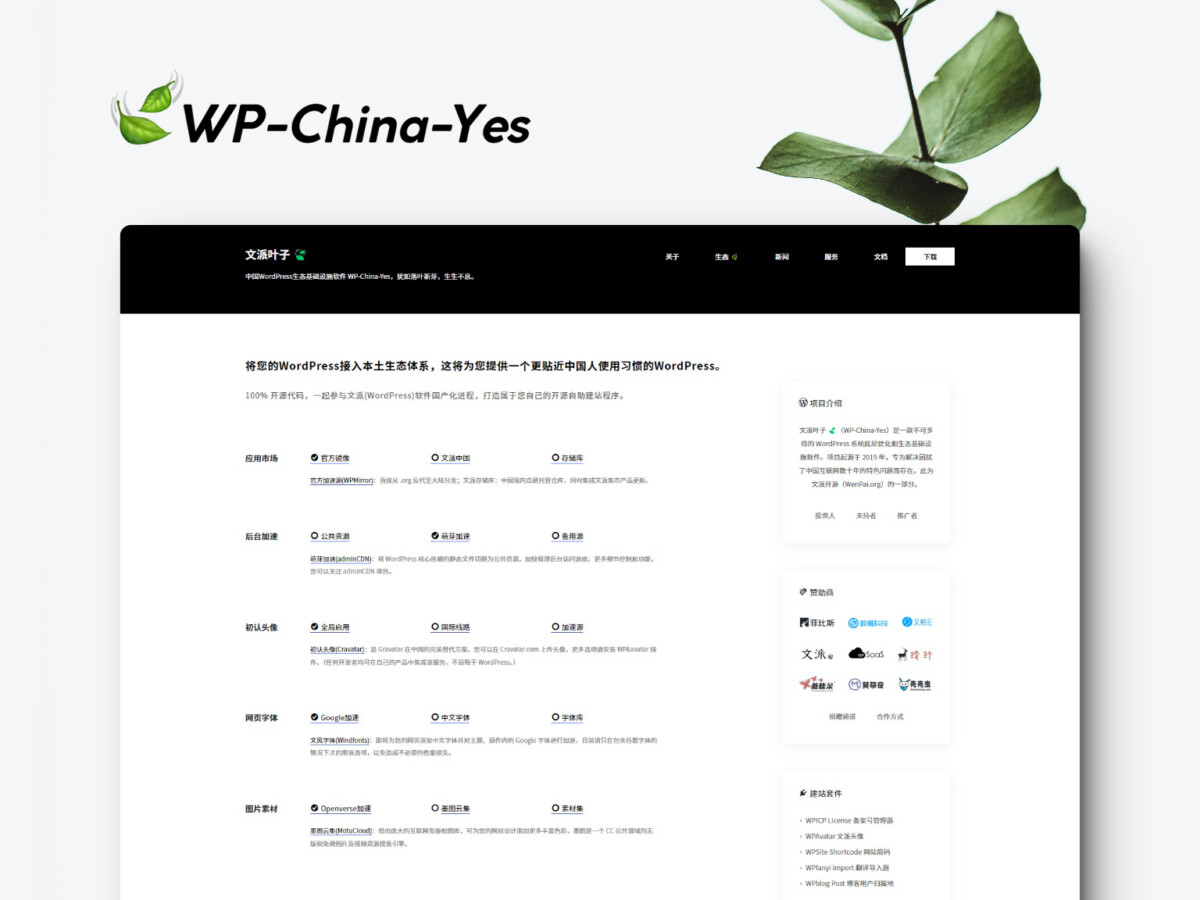 文派叶子 🍃(WP-China-Yes)是一款不可多得的 WordPress 系统底层优化和生态基础设施软件。项目起源于 2019 年,专为解决困扰了中国互联网数十年的特色问题而存在。此为文派开源(WenPai.org)的一部分。