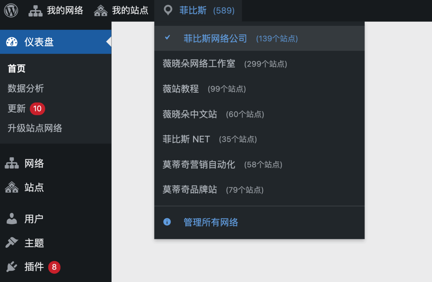 WP Multi Network Switcher 插件就是转为多网络中的超级管理员提供的一款效率工具,你可以在仪表盘以及顶部工具栏直观的看到自己以及创建了多少个站群网络,并且实现一键切换,非常方便。