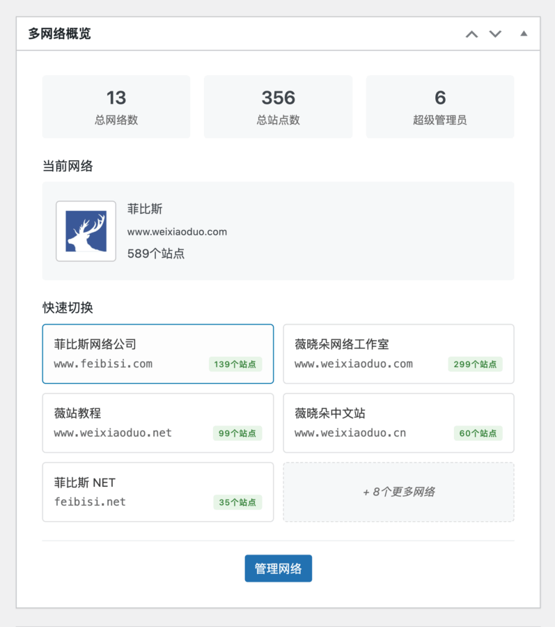 文章首发于: WP Multi Network Switcher 发布,更直观的文派多网络切换器,三级站群快速管理。 – 薇晓朵今日简报