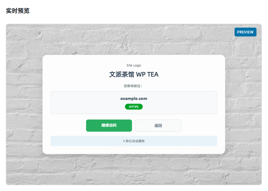- 倒计时显示:可设置5-30秒自动跳转,并显示剩余时间