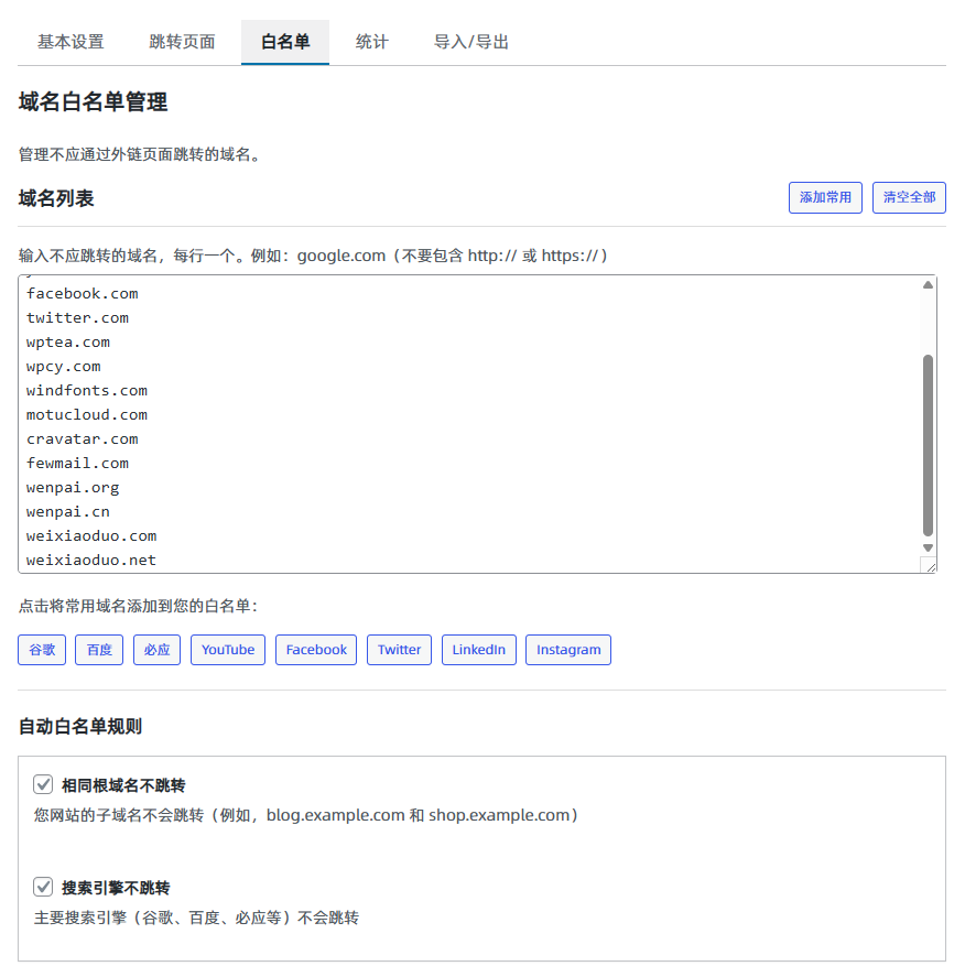 通过这个功能,你可以确保用户访问这些受信任网站时无需经过跳转确认页,直接快速跳转,同时仍然保持对其他外部链接的安全控制。